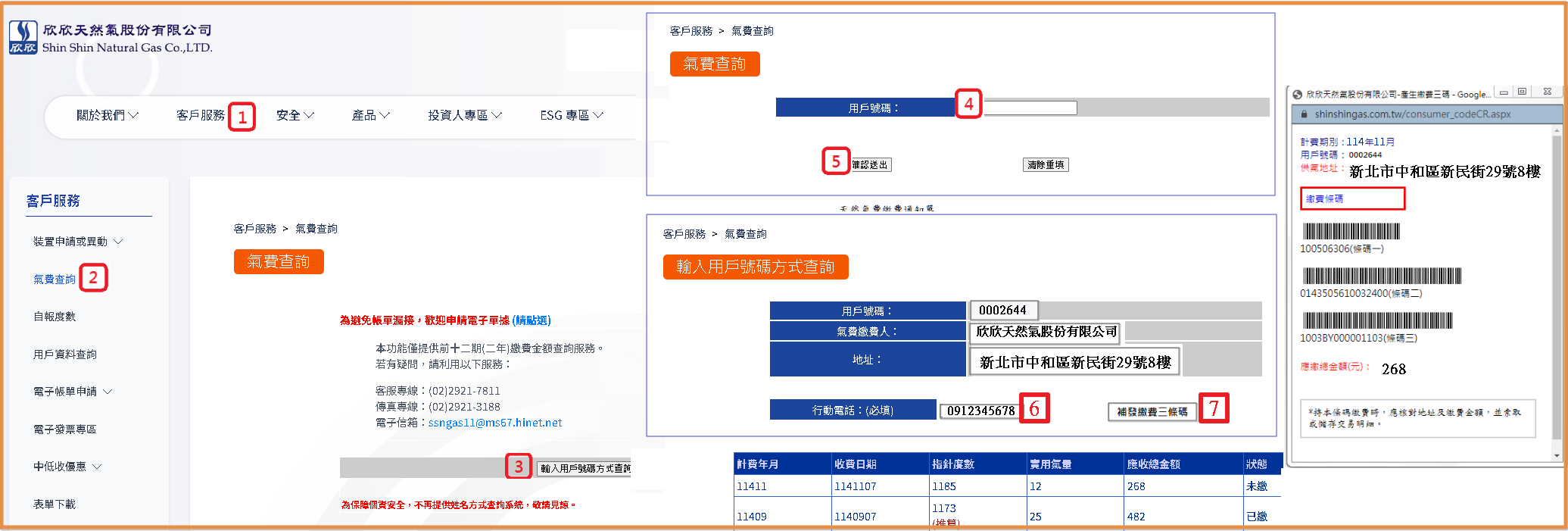 網頁操作流程說明如下: 在本公司網頁選擇[用戶服務][氣費查詢],按下[輸入用戶號碼方式查詢],輸入用戶號碼後選擇[確認送出],[輸入行動電話]後按下[補發繳費三條碼],即可顯示三條碼繳費。