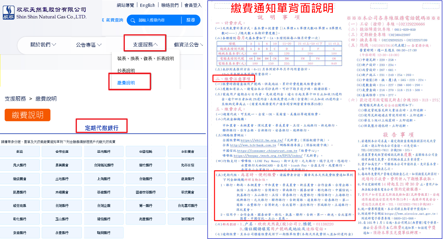 三、【參考依據與相關資訊】 (一)本公司官網說明路徑如下(如1-3圖): 欣欣天然氣官網首頁→氣費付款方式→定期代繳銀行 https://www.shinshingas.com.tw/directory_payment.html (二)繳費通知單背面繳費方式說明圖:(如附件) (三)各金融機構之授權書格式,可於「下載專區」查閱。 欣欣天然氣官網首頁→下載專區→金融機構授權書範例 https://www.shinshingas.com.tw/download.aspx